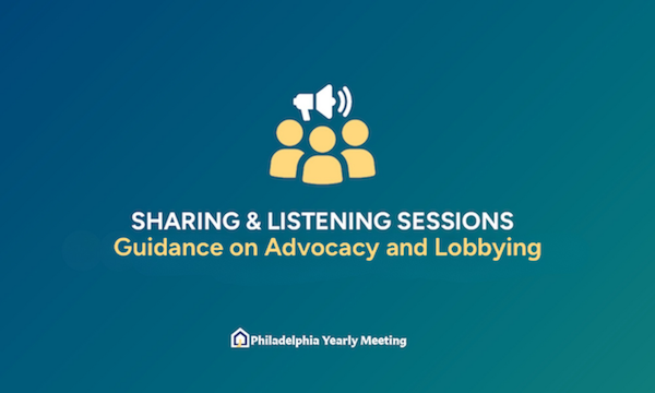 As many of you know, Philadelphia Yearly Meeting has been working to craft a Guidance on Advocacy and Lobbying to support the witness of our PYM groups (Councils, Collaboratives, and others engaged in activism). We have listened, Sprinted, threshed, and discerned the need and the contents of the Guidance on Advocacy and Lobbying draft document. It is our intention to bring this draft Guidance to Continuing Sessions in November 2025 for further discernment. Our goal is to bring PYM to unity on the Guidance for Advocacy and Lobbying. This listening session is a time for all Friends to read the draft, ask questions, and share insights.